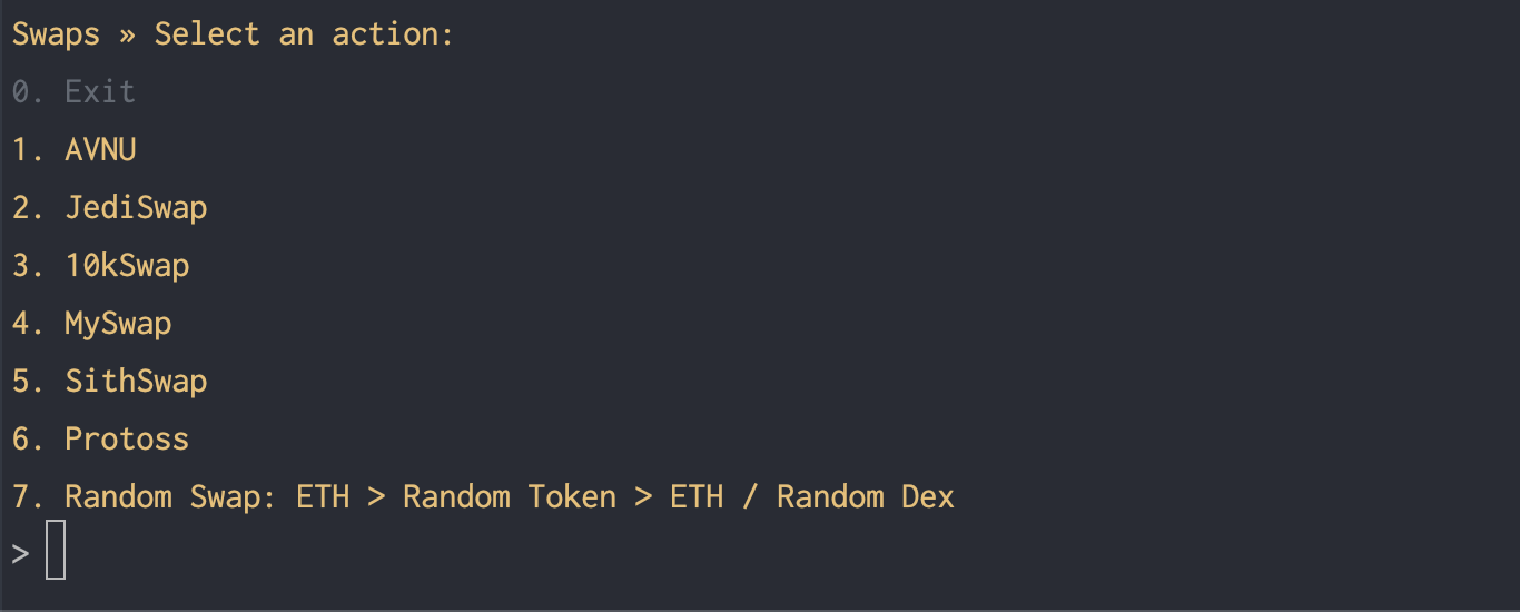 \- Выбирается рандомный декс AVNU или SithSwap и выполняется обмен USDC>USDT, снова выбирается рандомный декс и меняем обратно USDT>USDC. Перед каждым повторением свапа у нас 50% вероятность вызвать рандомную функцию для построения более уникального маршрута.\